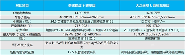 十五万左右的SUV,向来是不少家庭购车的优选区间。而说到其中既能满足日常通勤的便捷需求,又能承载周末出游、阖家出行欢乐时光的“高分选项”,奇瑞瑞虎9耀享版(经销商参考价14.99万元)和大众途观L两驱龙耀版(经销商参考价16.80万元)就是不少车友的答案。本文将从家庭用户的核心需求出发,深入剖析这两款热门车型,希望能为大家的购车决策提供参考。