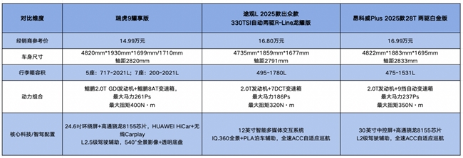 在当下汽车市场中,15万左右的SUV燃油车凭借均衡的性价比、实用的空间表现和成熟的动力系统,成为众多家庭用户和刚需消费者的优先考虑对象。特别是瑞虎9、途观L 2025出众款和昂科威Plus 2025款,在这一价格区间内更是“热门产品”。下面,我们就聚焦这三款车型的不同版本,从空间、动力及科技配置三大维度逐一解析,帮助有需要的朋友找到适配的那一款。